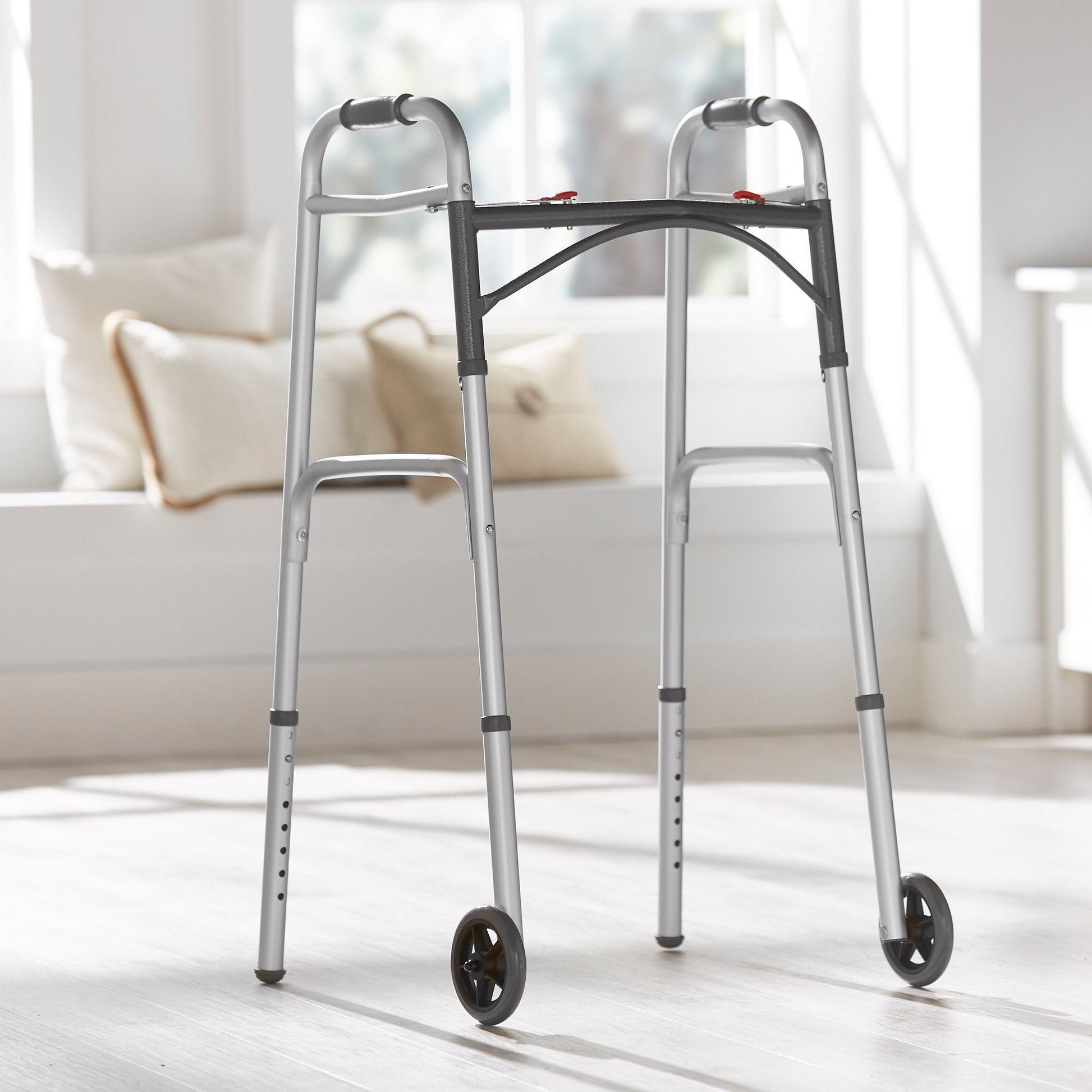 The McKesson Folding Aluminum Walker offers 1-inch aluminum construction for durability and stability. The walker includes push-button dual-release mechanisms for easy folding, accommodating various user needs and adding convenience for storing and travel. Its 5-inch front wheels and updated rear glide caps make for smooth movement across most surfaces, while the adjustable height and vinyl-contoured hand grips—spaced 17 inches apart—enhance comfort and stability. The U-shaped front cross-frame design provides increased clearance, enabling the user to bring the walker closer for greater support when transitioning between sitting and standing positions.
