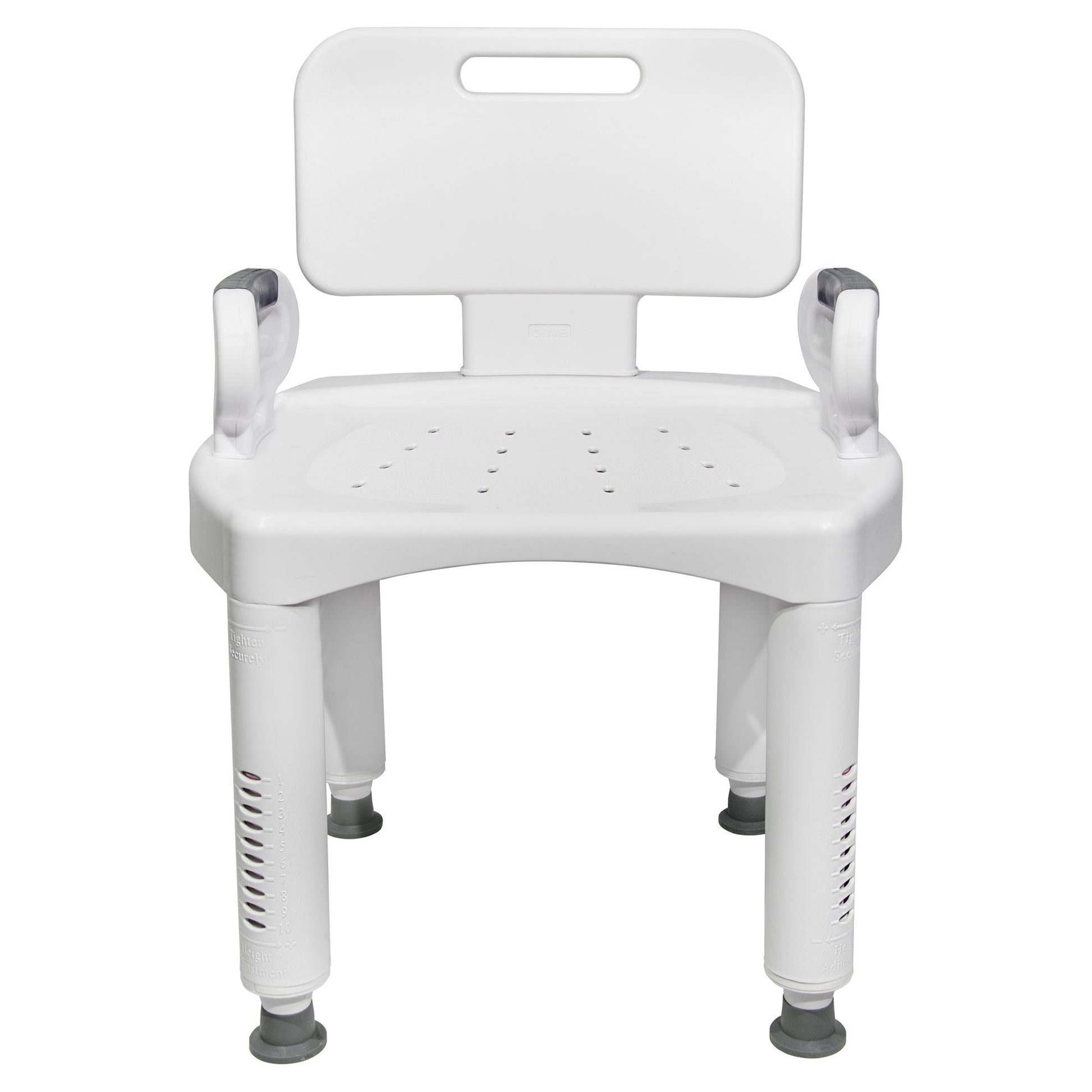 - Make simple tool-free ½" leg adjustments to the plastic bath bench; indicator window displays the chosen level to easily find height preferences