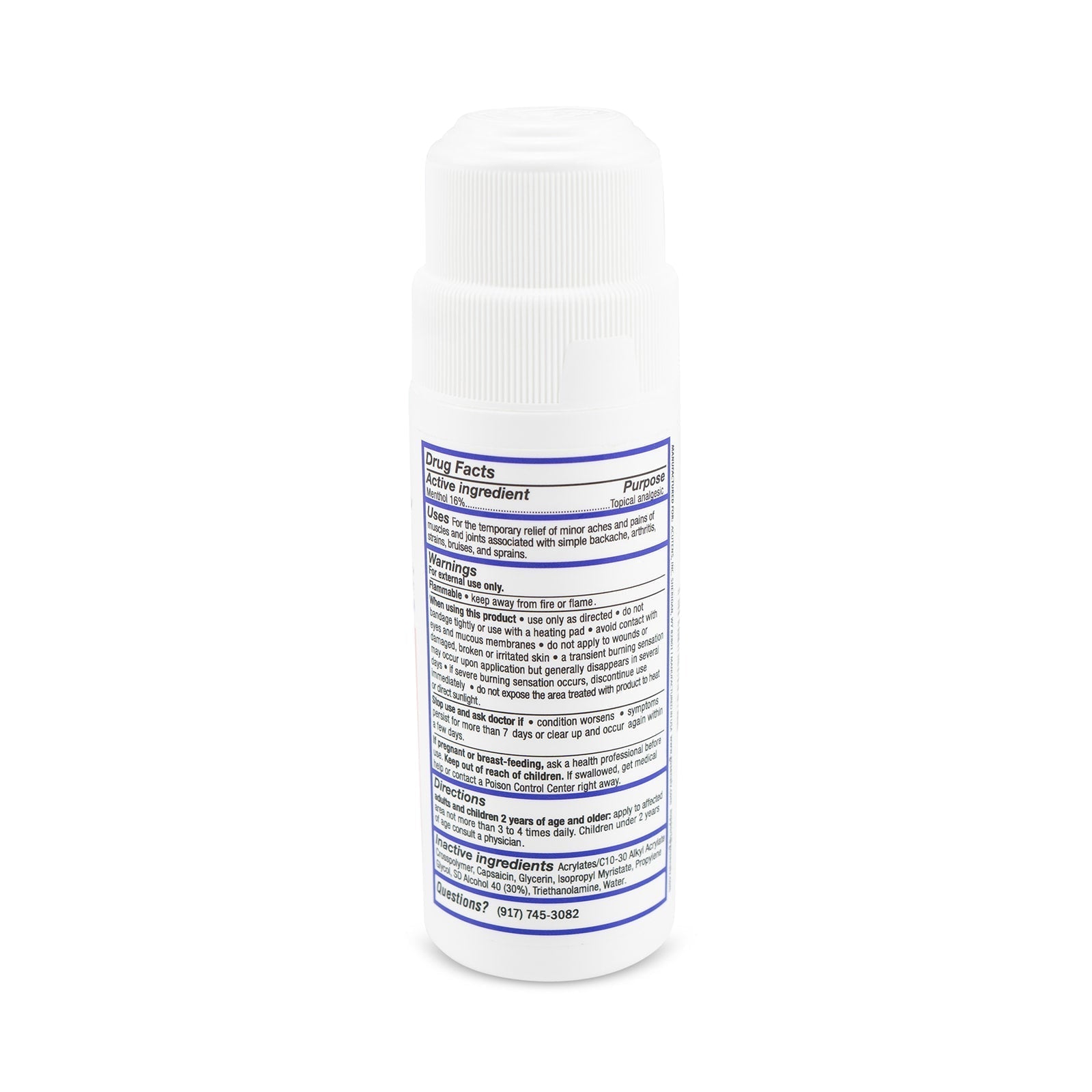Active Ingredient: Menthol 16% (Topical Analgesic) Inactive Ingredients: Acrylates/C10-30 Alkyl Acrylate Crosspolymer, Capsaicin, Glycerin, Isopropyl Myristate, Propylene Glycol, SD Alcohol 40 (30%), Triethanolamine, Water.