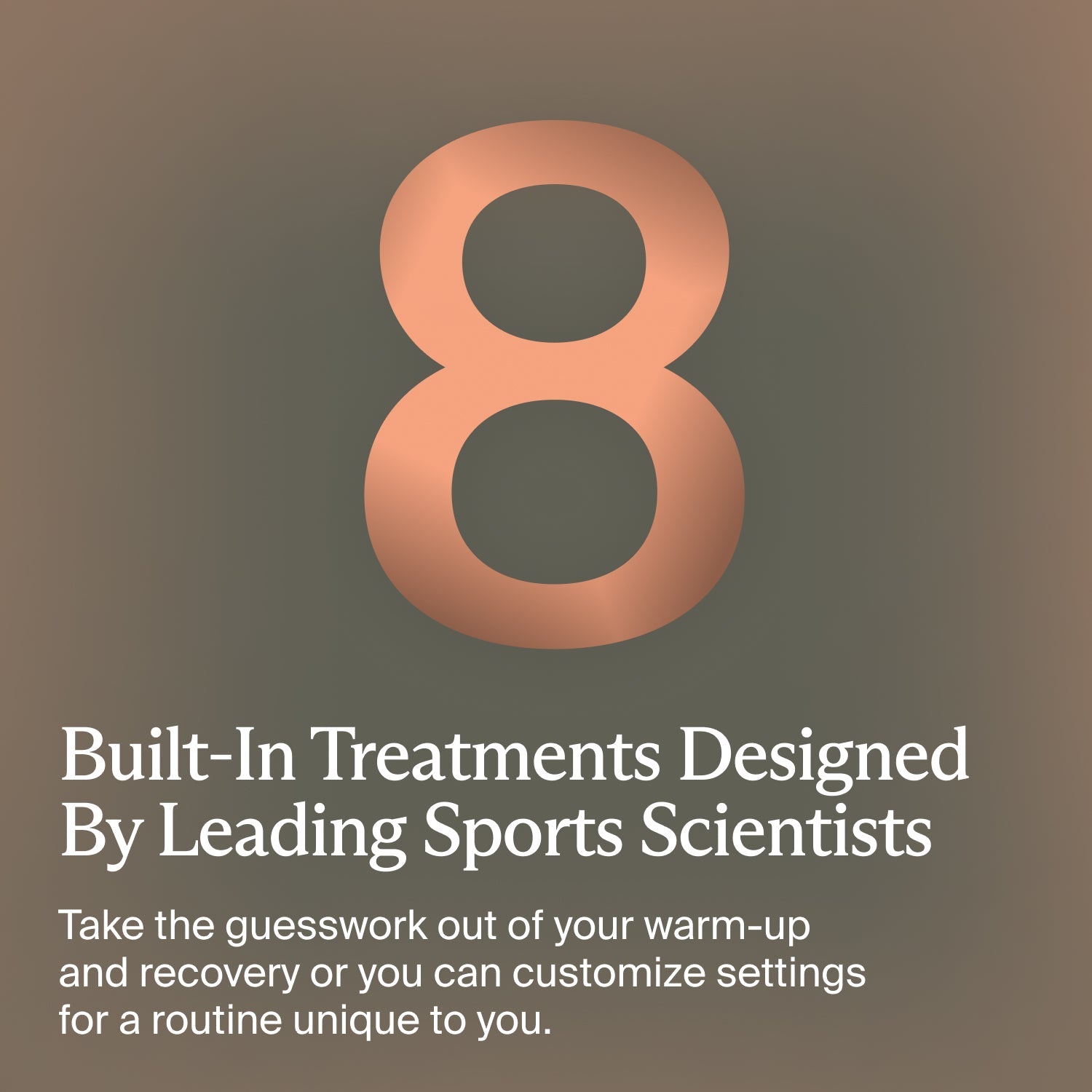 - 8 built-in preset treatments, designed by top sports scientists for athletes, combine scientifically optimized treatment time, pressure level, vibration, infrared LED settings and specific pressure chambers for the ultimate recovery experience.